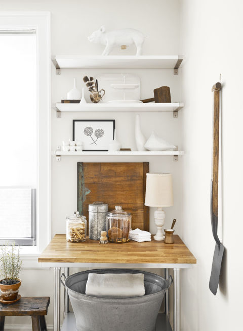 Çekmece kullanmak yerine, yüksek rafların üstüne koydukları şık cam kavanozları mandal vb. gibi pratik ürünlerle doldurmuşlar.