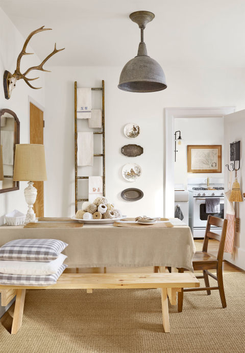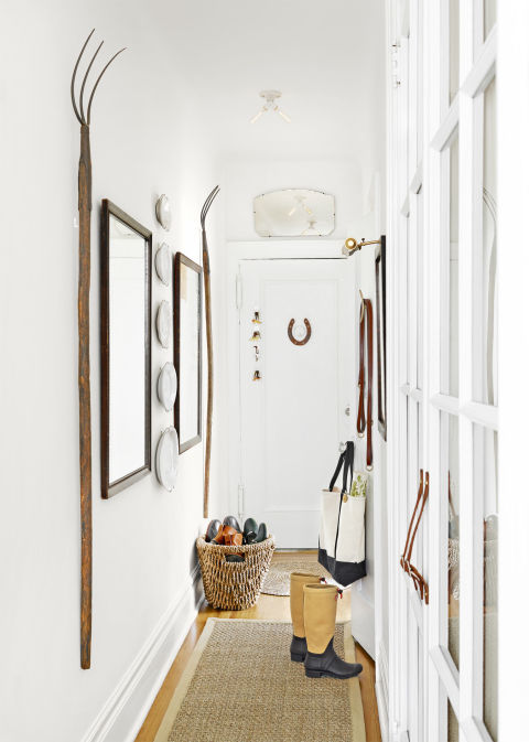 Girişe havalı bir görünüm katmak için, Jacqueline, Benjamin Moore'un aydınlık (White Wisp) rengiyle göz kamaştıran doğal ışığı yakalayarak tüm alanlarda ve pencerelerde uygun renk tonlarını kullanmış. Girişte duvarlara şaşırtacak kadar ucuz ama çiftlik havasını verecek (demir taş plakaları, bahçe aletleri) asarak dokusal bir görünüm yaratmış.