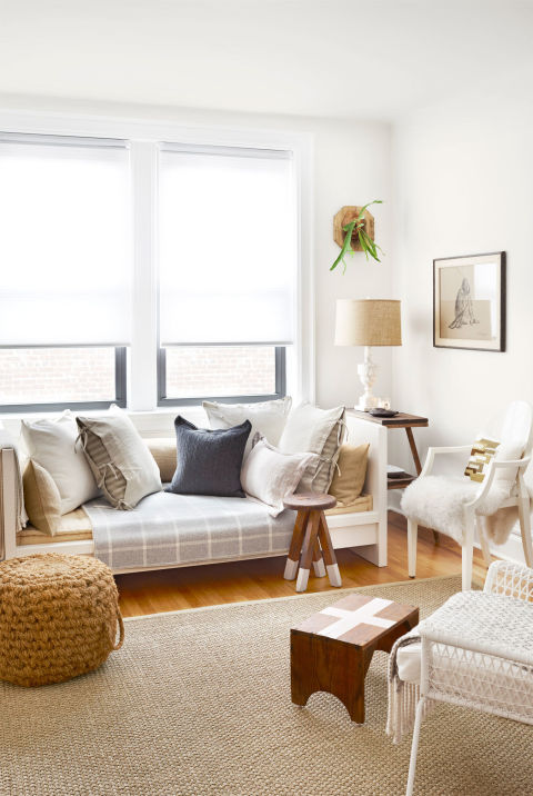 Jacqueline, evinde ara sıra gece konaklayacak konuklarını ağırlamak için yerden yeterince tasarruf sağlayan bir divan oluşturmak için Ikea çekyat yatak kullanarak, kanepenin kenarlarına, bir şilte takmış.