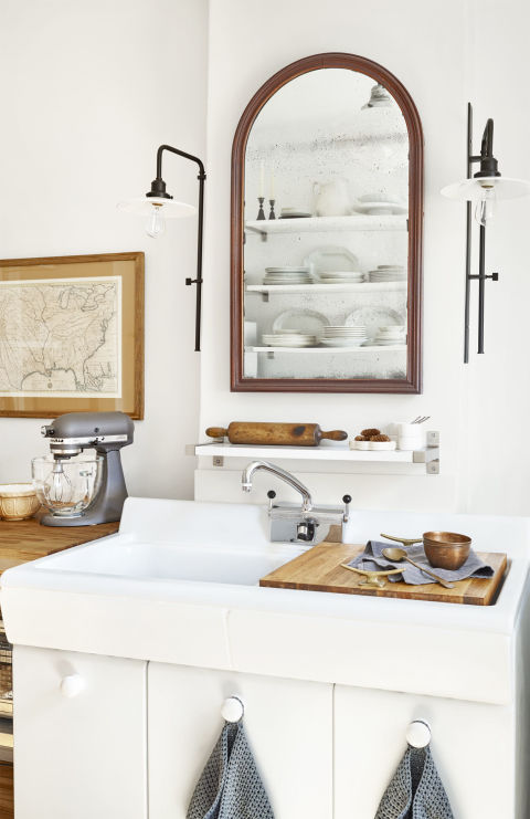 Lavabonun üstünde dolap olmamasını sorun etmeyerek ahşap çerçeveli antika bir ayna kullanarak ışığı en üst düzeye çıkarmışlar.